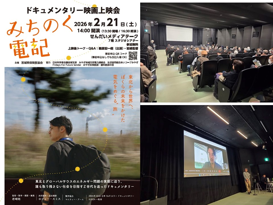 ★ 2026/2/21 宮城保険医協会主催でみやぎ地域市民電力も共催した「みちのく電記」上映会とトークが仙台メディアテーク会場で行われました。岩崎監督は会場で、主人公の鴫原さんはフィリピンからオンラインで参加してくれました。参加は120名を超え、盛り上がりました。